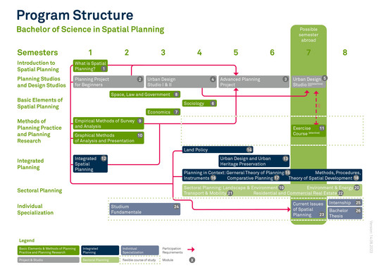Completion of modules 1, 2, 8, 9, and 12 is a prerequisite for completion of the integrating spatial planning modules (modules 14, 15, 16, 17, 18) and module 23 (Current Issues of Spatial Planning). Module 4 (Urban Design Studio I & II) can be taken at the beginning of the 3rd semester, which extends over two semesters. Modules 6 (Sociology) and 7 (Economics) each last one semester.
