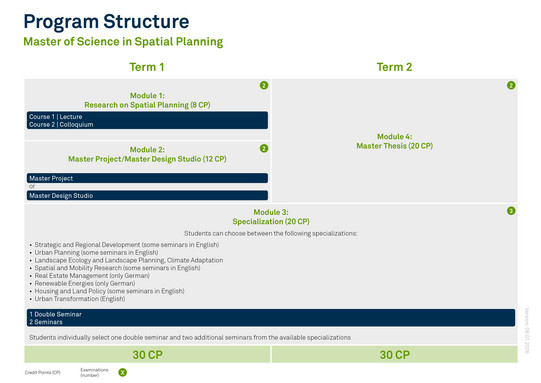 The standard period of study for the Master's degree in Spatial Planning is two semesters. In order to graduate with the academic degree "Master of Science", a total of 60 credit points (LP) must be acquired in the following four modules: